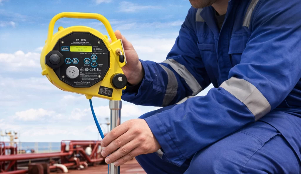 SHT2002 UTI Tape is a gas tight portable gauging device system designed to measure ullage, oil/water interface level, and temperature in single operation. It is used for tank level measurement on marine vessel.